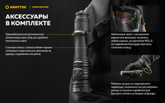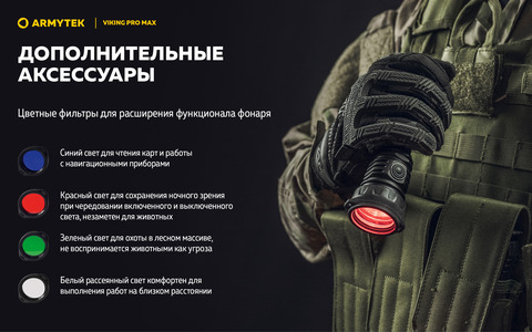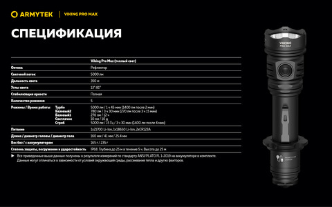 Viking Pro Max совместим со специально разработанной магнитной выносной кнопкой и оригинальными креплениями для подствольного применения. Модель работает не только на комплектном элементе питания, но и на любом стандартном аккумуляторе 21700 Li-Ion, а также, благодаря адаптеру, на аккумуляторе 18650 Li-Ion или на двух литиевых батарейках CR123A. Вариативность элементов питания позволяет значительно повысить автономность.