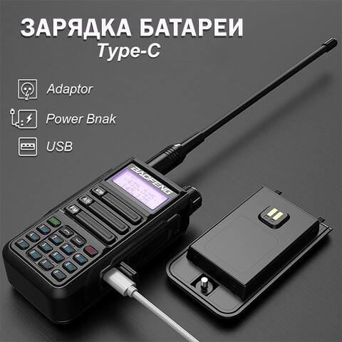 Функция программирования каналов с клавиатуры и два диапазона частот (VHF 136-174 МГц и UHF 400-520 МГц) позволяет использовать радиостанцию в различных условиях и местах. Отличительной особенностью рации является наличие разъема Type-C для зарядки устройства через usb без настольного З/У.